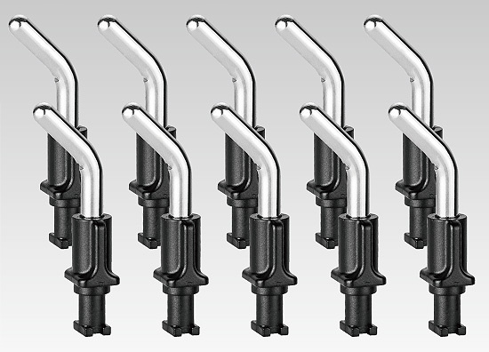 引っ掛けるだけの簡単収納を実現する、40mm長のプラスチック製フックを10個付属しております。対荷重は100gですので、比較的軽めの物を吊り下げて収納するのに便利です。重たい物はスチールフックに任せて、軽い物を収納してください。