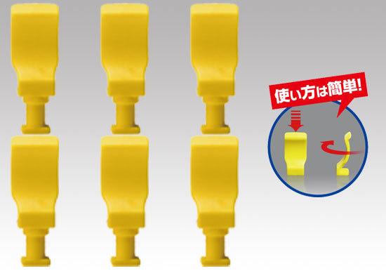 引っ掛けるだけの簡単収納を実現する、40mm長のプラスチック製フックを6個付属しております。対荷重は100gですので、比較的軽めの物を吊り下げて収納するのに便利です。