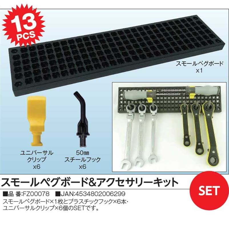 フリーゾーンの基本となるペグボードのスモールサイズ(黒色)が1枚付属しております。ペグボードとは特許構造の格子状の穴が開いた専用のボードです。四隅のネジ穴を利用して付属のネジで固定します。またオプションの「マグネット固定金具」を使用して固定することも可能です。全てのオプションパーツを取り付ける基本となります。またオプションパーツを使用することなく1/4”ビットの工具部品を直接差し込み収納することが可能です。